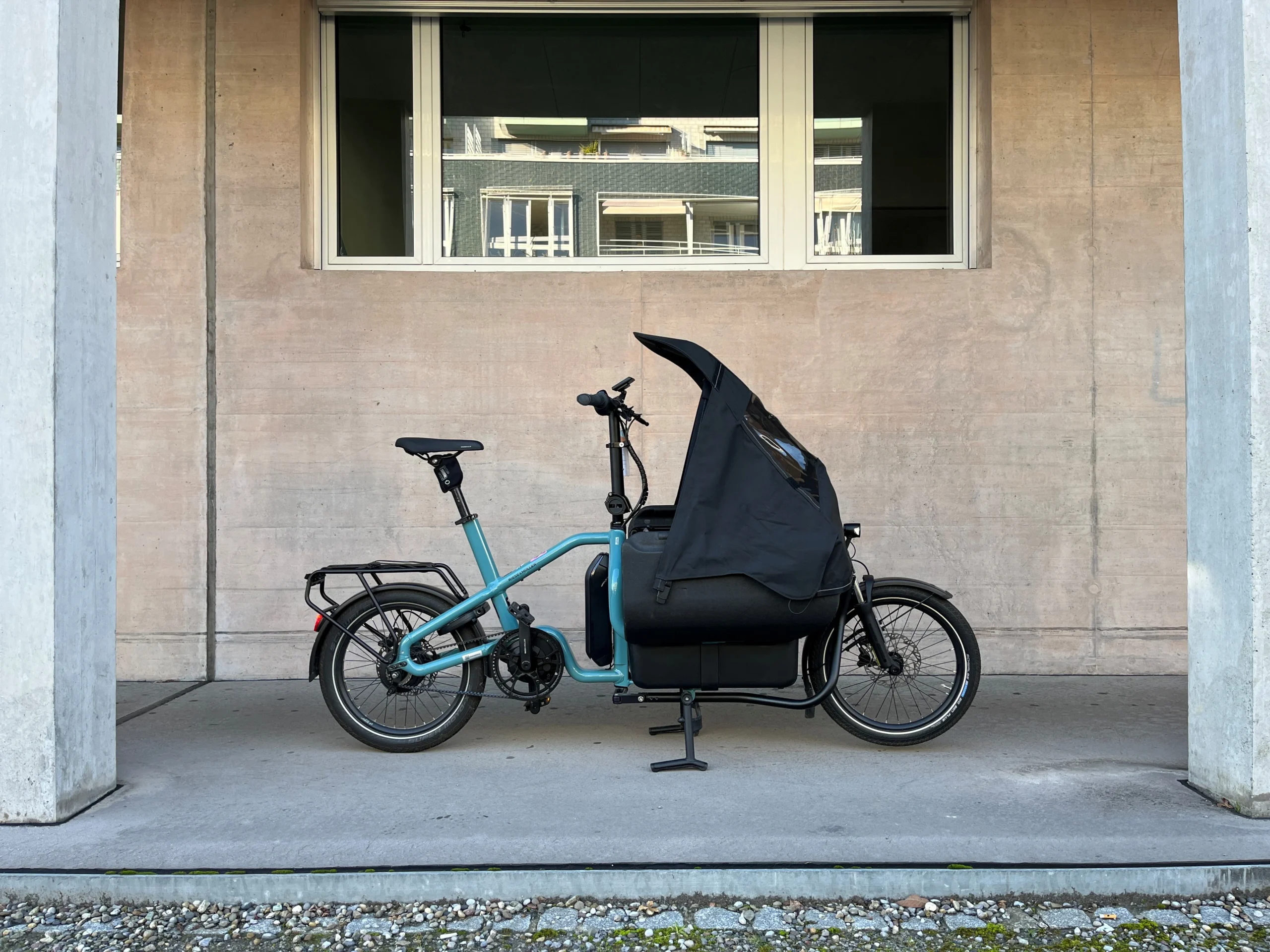 Natürlich schütz das nigelnagelneue Regenverdeck die Kinder oder den Wocheneinkauf.